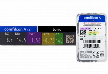 Las lentes de contacto Biofinity Toric (También conocidas como COMFILCON A TORIC) se presentan en una caja de 3 unidades. Estas lentillas pertenecen a la familia de las lentillas tóricas. Este tipo de lentillas están especialmente indicadas para compensar el astigmatismo. Si usted está buscando unas lentillas tóricas baratas pero no quiere renunciar a unas lentes de contacto de calidad. Las lentillas Biofinity Toric pueden ser una opción muy a tener en cuenta.
