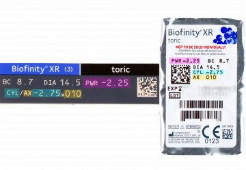 Son iguales en cuanto a diseño y composición, la única diferencia es que la XR (Xtended Range) amplía la graduación respecto a las Biofinity Toric, sobre todo para astigmatismos e hipermetropías altas. Las Biofinity XR Toric llegan hasta miopías e hipermetropías de 20.00 D y astigmatismos de -5.75 D con ejes en pasos de 5º.
